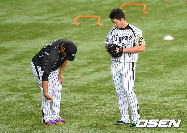 오승환이 2일 오후 일본 오사카 교세라돔에서 열리는 '2014 일본프로야구' 한신 타이거스 대 주니치 드래건스의 경기를 앞두고, 외야에서 캐치볼 훈련을 하던 중 후쿠하라 시노부와 포크볼 그립에 관해 대화를 나누고 있다.