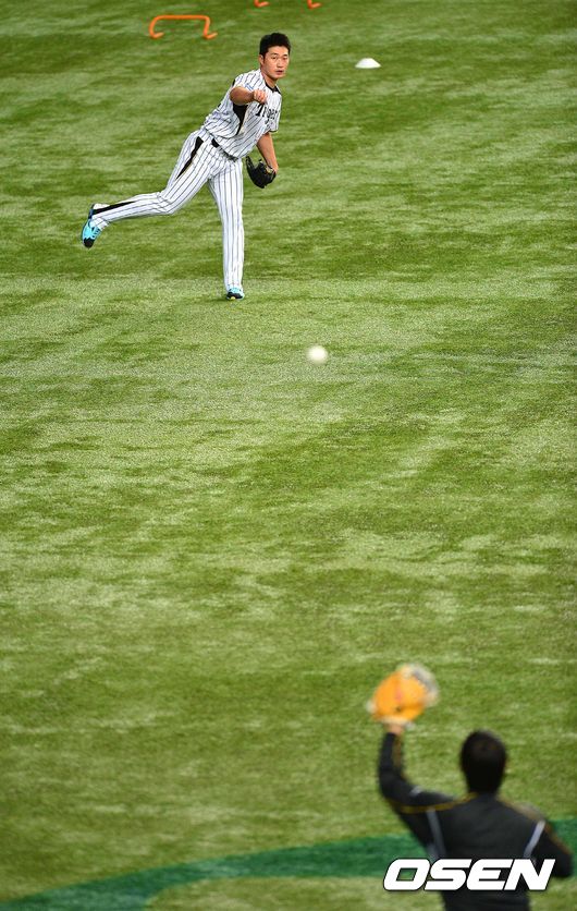 오승환이 2일 오후 일본 오사카 교세라돔에서 열리는 '2014 일본프로야구' 한신 타이거스 대 주니치 드래건스의 경기를 앞두고, 외야에서 캐치볼 훈련을 하고 있다.
