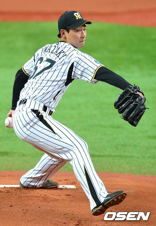 한신 선발 이와자키 수구루가 힘차게 공을 뿌리고 있다.