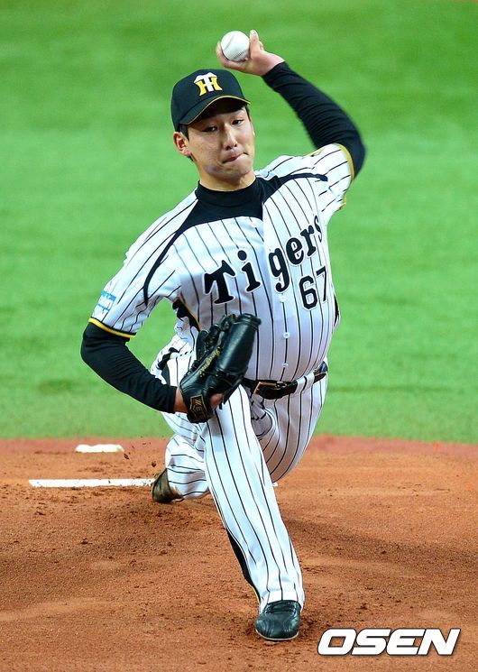 한신 선발 이와자키 수구루가 힘차게 공을 뿌리고 있다.