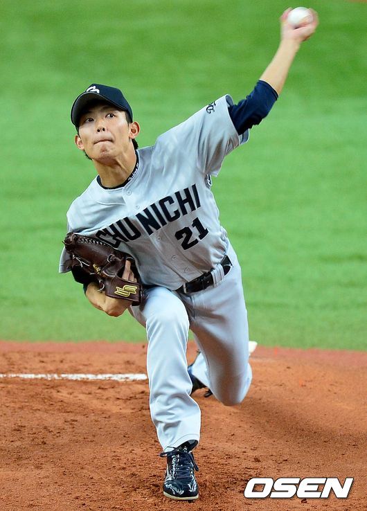 주니치 선발 오카다 도시야가 힘차게 공을 뿌리고 있다.