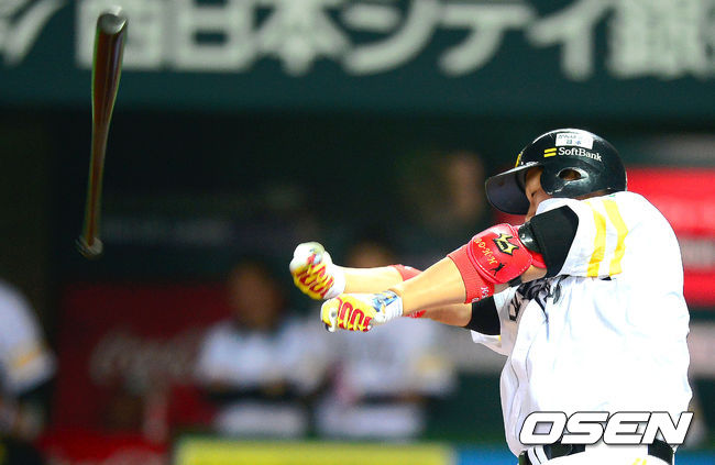 1회말 2사 2루 소프트뱅크 이대호가 배트를 놓치고 있다.