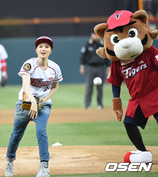 2일 오후 광주-기아챔피언스 필드 에서 열린 '2014 한국야쿠르트 세븐 프로야구' KIA 타이거즈와 NC 다이노스 경기에 앞서 가수 거미가 승리기원 시구를 하고 있다.