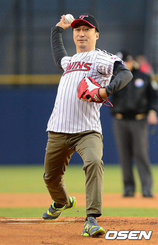 2일 오후 서울 잠실구장에서 열린 '2014 한국야쿠르트 세븐 프로야구' LG 트윈스와 SK 와이번스의 경기 시작전 이성민이 시구를 하고 있다.