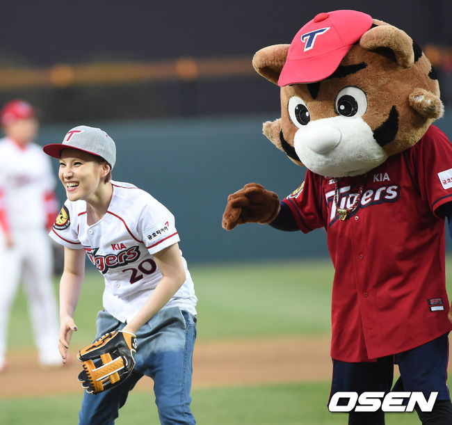 2일 오후 광주-기아챔피언스 필드 에서 열린 '2014 한국야쿠르트 세븐 프로야구' KIA 타이거즈와 NC 다이노스 경기에 앞서 가수 거미가 승리기원 시구를 하고 있다.