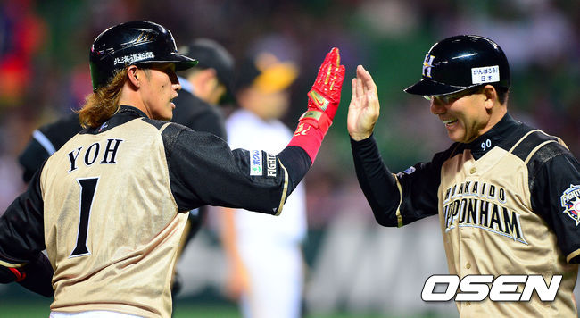 3회초 1사 니혼햄 요 다이칸이 솔로 홈런을 때린 뒤 3루 코치와 기뻐하고 있다.