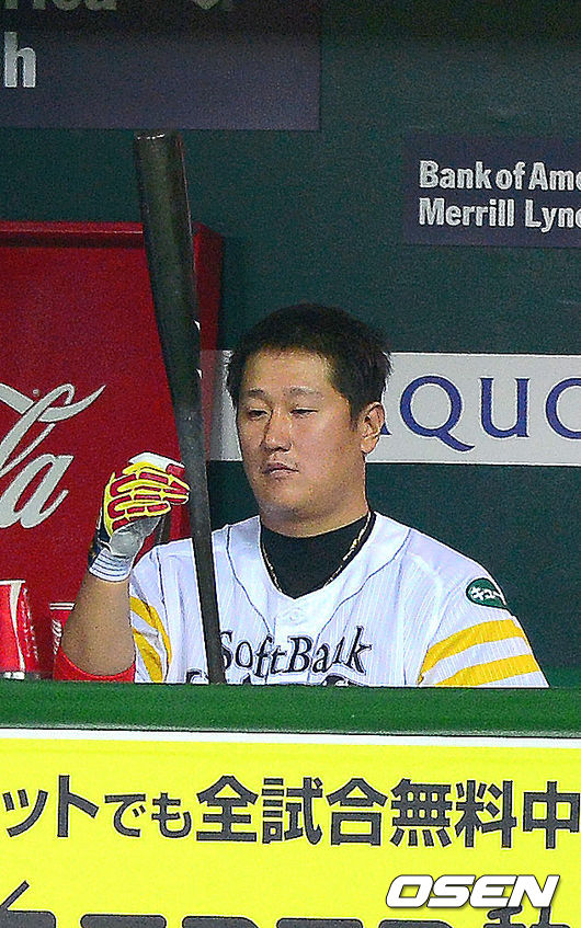 소프트뱅크 이대호가 벤치에 앉아 배트를 손질하고 있다.