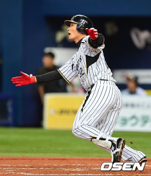 4회말 한신 공격 1사 1, 3루 상황 아라이 료타가 1타점 적시 중견수 2루타를 날리고 타구를 바라보고 있다.