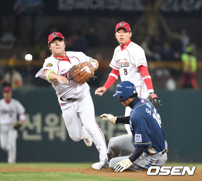 2일 오후 광주-기아챔피언스 필드 에서 열린 '2014 한국야쿠르트 세븐 프로야구' KIA 타이거즈와 NC 다이노스 경기, 4회초 1사 1,2루 손시헌의 내야땅볼때 KIA 김선빈 유격수가 1루주자 모창민을 포스아웃 시키며 1루에 송구 병살아웃 처리 시키고 있다.