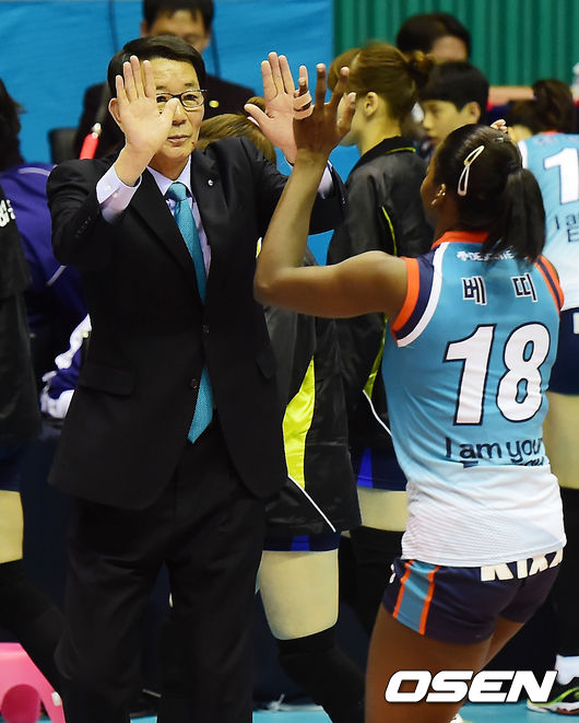 경기를 마치고 GS칼텍스 이선구 감독이 베띠와 하이파이브를 하고 있다. / rumi@osen.co.kr