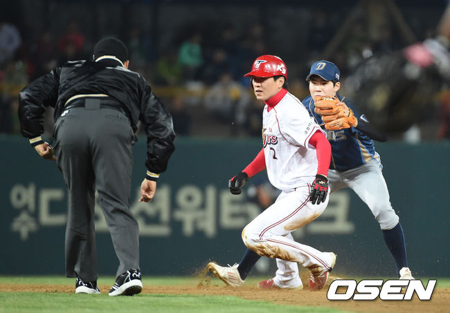 2일 오후 광주-기아챔피언스 필드 에서 열린 '2014 한국야쿠르트 세븐 프로야구' KIA 타이거즈와 NC 다이노스 경기, 4회말 2사 1루 나주완 타석때 1루 주자 신종길 2루 도루를 하였으나 태그아웃 처리되고 있다.