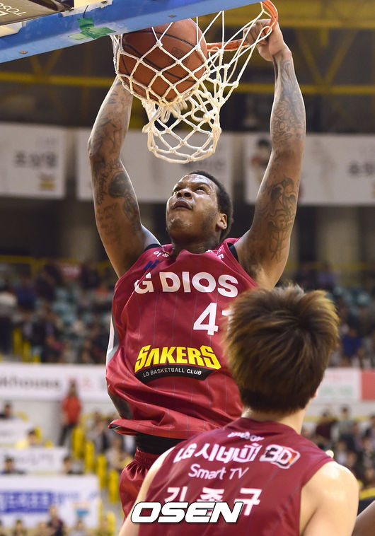 2일 오후 경남 창원실내체육관서 진행된 '2013-2014 프로농구 챔피언 결정전 창원 LG와 울산 모비스의 경기, 2쿼터 LG 제퍼슨이 덩크슛을 성공시키고 있다.