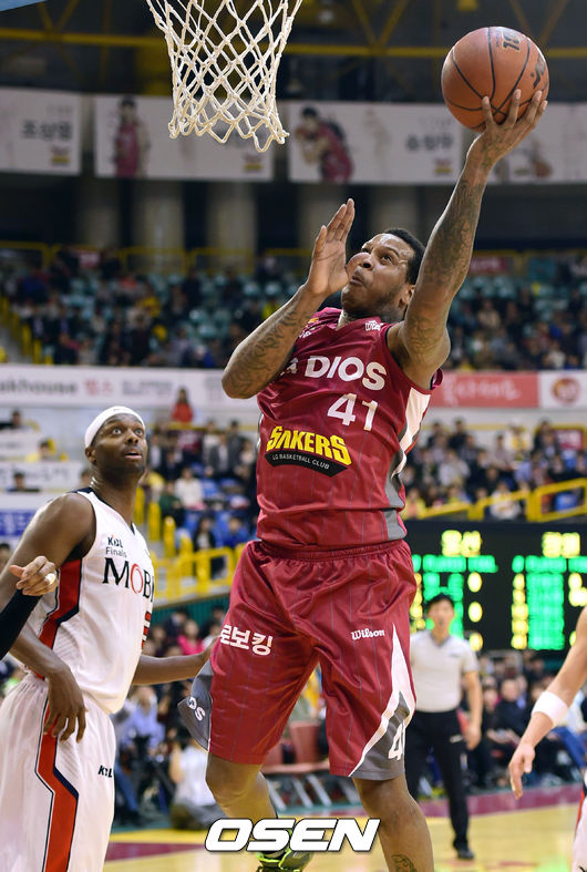 2일 오후 경남 창원실내체육관서 진행된 '2013-2014 프로농구 챔피언 결정전 창원 LG와 울산 모비스의 경기, 2쿼터 LG 제퍼슨이 골밑슛을 성공시키고 있다