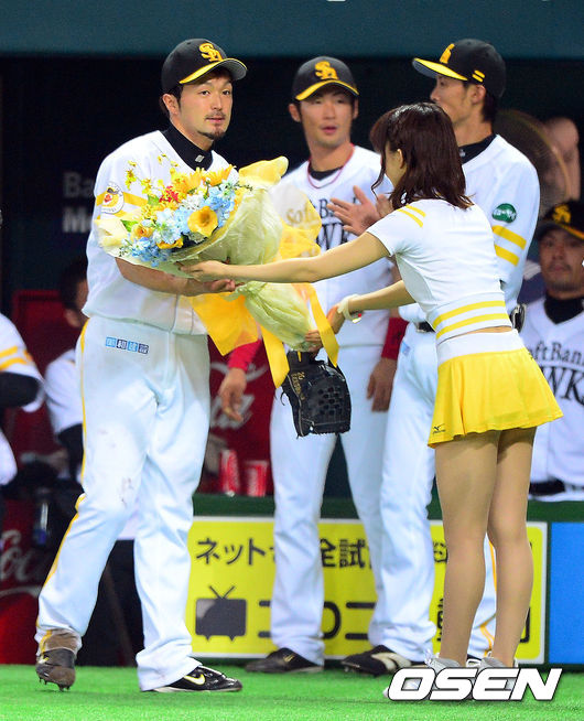 5회초 종료 후 소프트뱅크 데라하라 하야토의 1000이닝 돌파 기념 꽃다발을 건네받고 있다.