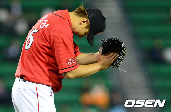 2일 오후 서울 잠실구장에서 열린 '2014 한국야쿠르트 세븐 프로야구' LG 트윈스와 SK 와이번스의 경기 4회말 선두타자 이병규를 땅볼로 처리한 윤희상이 고개를 숙이며 글러브를 치고 있다.