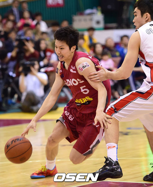 2일 오후 경남 창원실내체육관서 진행된 '2013-2014 프로농구 챔피언 결정전 창원 LG와 울산 모비스의 경기, 2쿼터 LG 김시래가 드리블을 하고 있다.