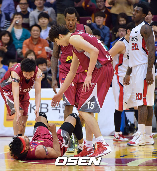 2일 오후 경남 창원실내체육관서 진행된 '2013-2014 프로농구 챔피언 결정전 창원 LG와 울산 모비스의 경기, 3쿼터 LG 문태종이 동료들의 부축을 받으며 일어나고 있다.