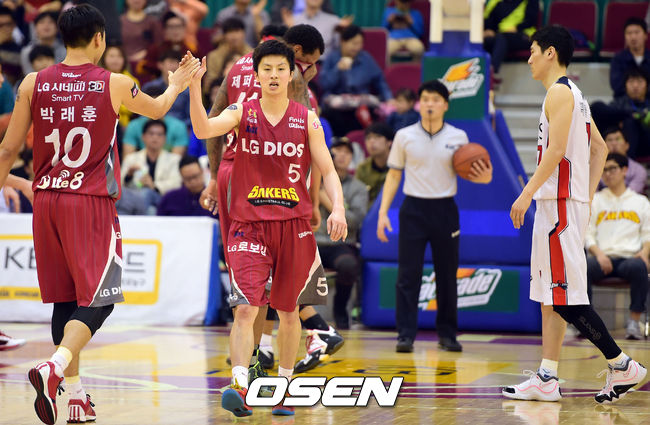 2일 오후 경남 창원실내체육관서 진행된 '2013-2014 프로농구 챔피언 결정전 창원 LG와 울산 모비스의 경기, 3쿼터 LG 제퍼슨의 역전2점슛때 김시래가 박래훈과 하이파이브를하고 있다.