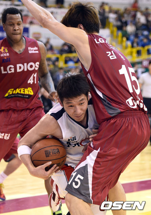 2일 오후 경남 창원실내체육관서 진행된 '2013-2014 프로농구 챔피언 결정전 창원 LG와 울산 모비스의 경기, 4쿼터 모비스 양동근이 LG 김종규에 막혀 고전하고 있다.