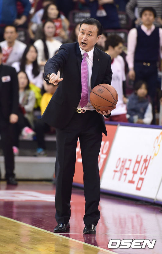 2일 오후 경남 창원실내체육관서 진행된 '2013-2014 프로농구 챔피언 결정전 창원 LG와 울산 모비스의 경기, 4쿼터 LG 김진 감독이 작전을 지시하고 있다.