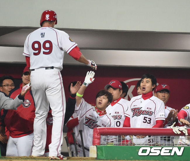 2일 오후 광주-기아챔피언스 필드 에서 열린 '2014 한국야쿠르트 세븐 프로야구' KIA 타이거즈와 NC 다이노스 경기,7회말 1사1루 필 좌월투런 홈런을 날리고 덕아웃 동료들의 환영을 받고 있다.
