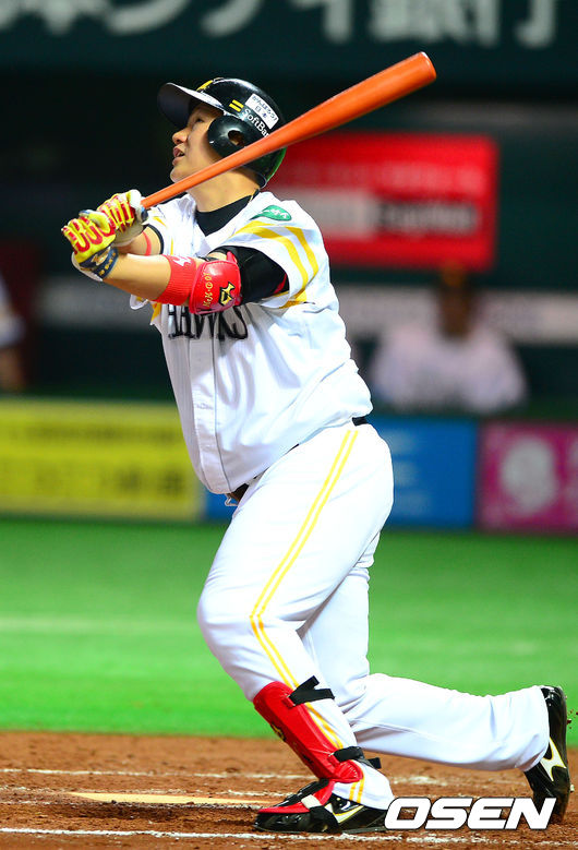 9회말 선두타자로 나선 소프트뱅크 이대호가 타격을 하고 있다. 결과는 중견수 플라이 아웃.