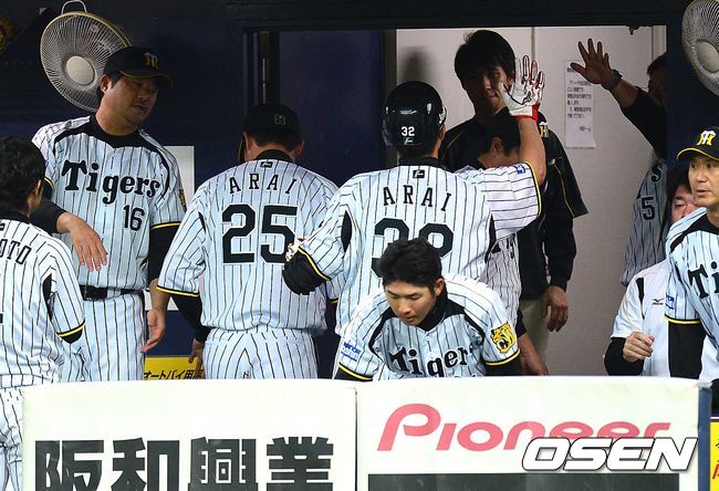8회말 한신 공격 1사 2, 3루 상황 아라이 료타가 1타점 우익수 희생플라이를 날린 뒤 친형 아라이 다카히로를 비롯한 동료들과 인사를 나누고 있다.