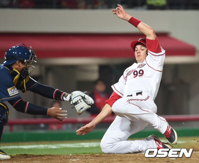 2일 오후 광주-기아챔피언스 필드 에서 열린 '2014 한국야쿠르트 세븐 프로야구' KIA 타이거즈와 NC 다이노스 경기,8회말 1사 1,3루 안친홍의 동점 적시타때 1루 주자 필 홈까지 쇄도하였으나 태그아웃 처리되고 있다.