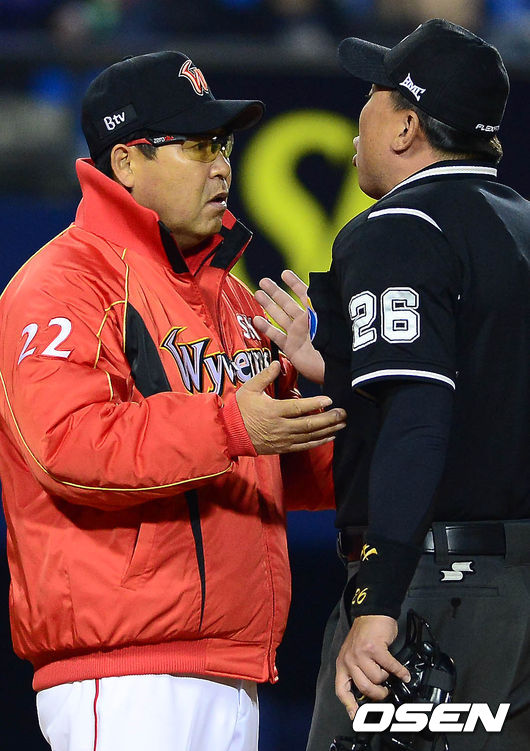 2일 오후 서울 잠실구장에서 열린 '2014 한국야쿠르트 세븐 프로야구' LG 트윈스와 SK 와이번스의 경기 8회말 1사 3루 정성훈 타석, 이재영의 위협구가 주심에게 경고를 받자 이만수 감독이 항의하고 있다.