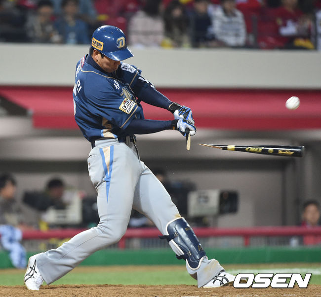 2일 오후 광주-기아챔피언스 필드 에서 열린 '2014 한국야쿠르트 세븐 프로야구' KIA 타이거즈와 NC 다이노스 경기,9회초 2사 2,3루 모창민 배트가 부러지면서 좌익수 플라이 아웃으로 물러나고 있다.