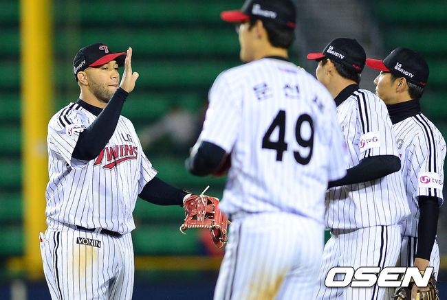 2일 오후 서울 잠실구장에서 열린 '2014 한국야쿠르트 세븐 프로야구' LG 트윈스와 SK 와이번스의 경기 종료 후 조쉬 벨이 동료들과 하이파이브를 하고 있다.