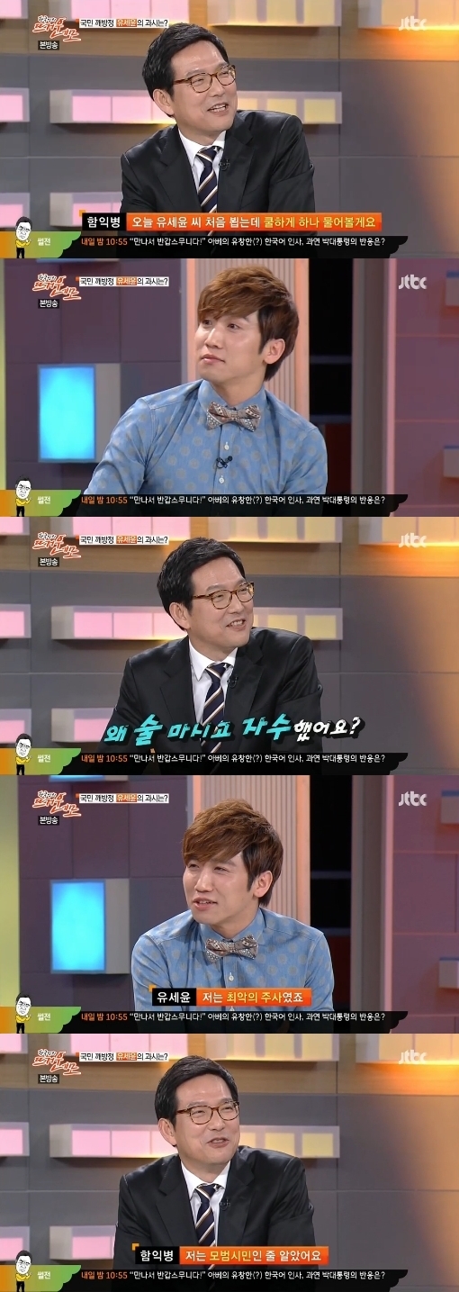 이에 유세윤은 “잊지 못할 최악의 주사다”라며 함익병의 질문에 조용이 입을 열었다. 함익병은 “나는 (유세윤이) 모범시민인 줄 알았다”고 말해 웃음을 자아냈다. 앞서 유세윤은 지난 해 음주운전 후 경찰에 자수해 논란이 됐다.