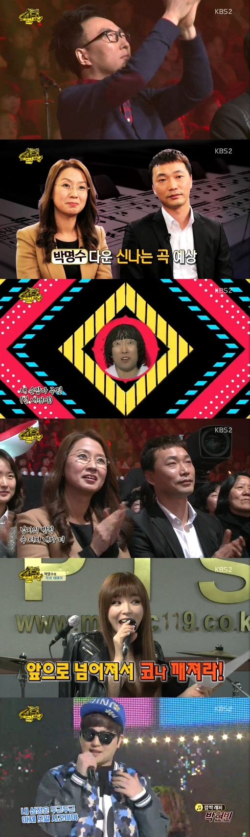 ‘밀리언셀러’ 박명수가 축구에 미친 남편에 대한 경고가 담긴 ‘남자의 반칙’으로 또 한 번의 음원차트 석권을 자신했다. 빠른 비트에 중독성 있는 가사는 주현미의 매력적인 음색과 만나 방청객을 들썩이게 만들었다.