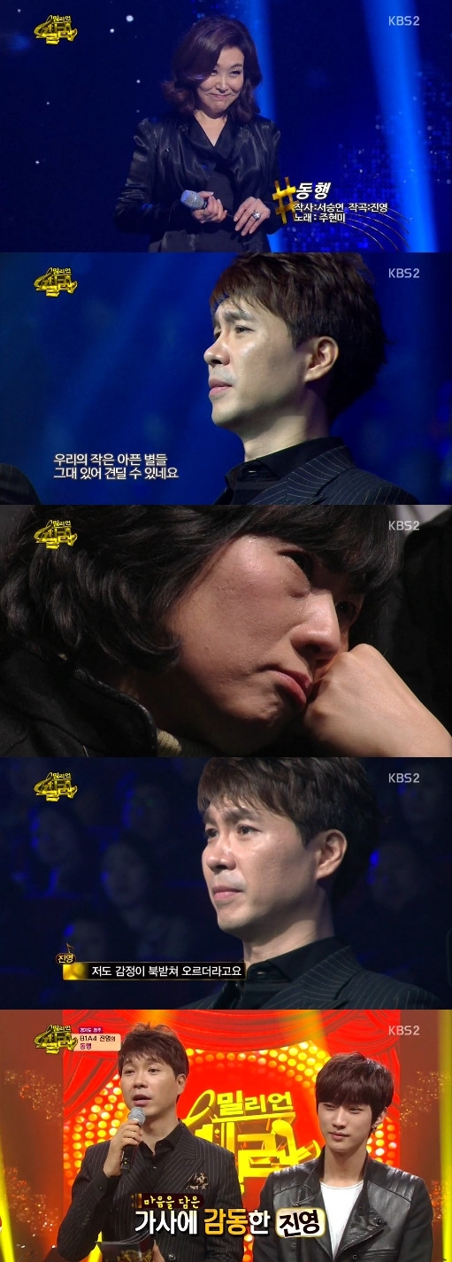 ‘밀리언셀러’ 박수홍이 주현미의 열창에 뜨거운 눈물을 쏟았다. B1A4 진영이 작곡한 ‘동행’은 몸이 아픈 아내와 아들. 말로 표현하지 못한 아내의 고마움이 묵직하게 담겨 있어 뭉클함을 선사했다.