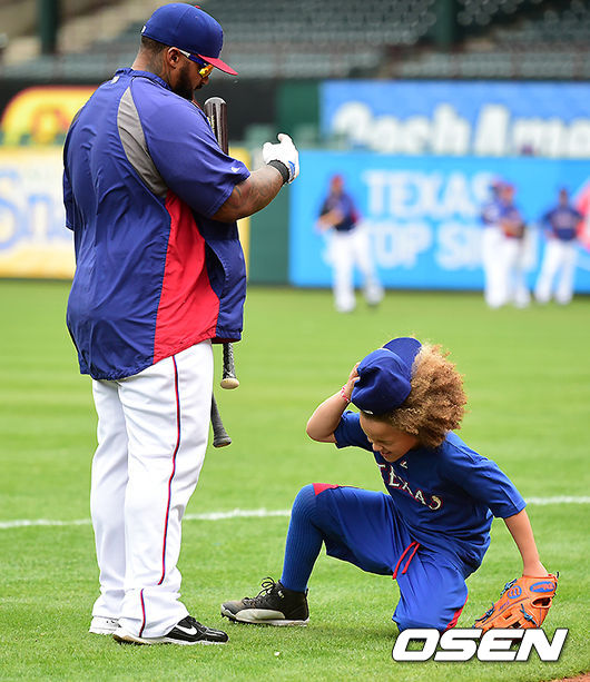 경기에 앞서 텍사스 프린스 필더가 아들이 외야에 캐치볼 하러 나가자 모자 쓰고 가라며 불러 세우고 있다.