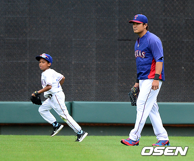경기에 앞서 텍사스 추신수가 벨트레 주니어와 외야에서 수비 훈련을 하고 있다.