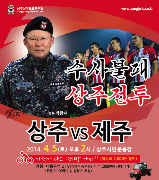 상주는 5일 오후2시 상주시민운동장에서 제주 유나이티드를 만난다. 이번 현대오일뱅크 K리그 클래식 2014 6R에서는 기필코 제주를 상대로 클래식 복귀 첫 승을 거두겠다는 결의가 가득하다.