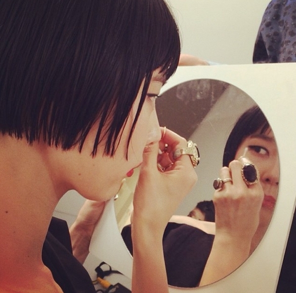 공개된 사진 속 김나영은 거울을 들여다보며 화장을 수정하고 있다. 가지런한 검은색 단발머리와 짙은 아이라인 그린 눈이 시선을 사로잡는다. 김나영은 손에 커다란 반지도 여러 개 껴 시크한 패션을 연출했다.