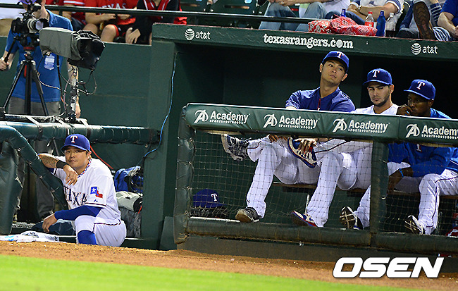 6회말 2사 1루에서 텍사스 추신수가 더그아웃에서 경기를 지켜보고 있다.