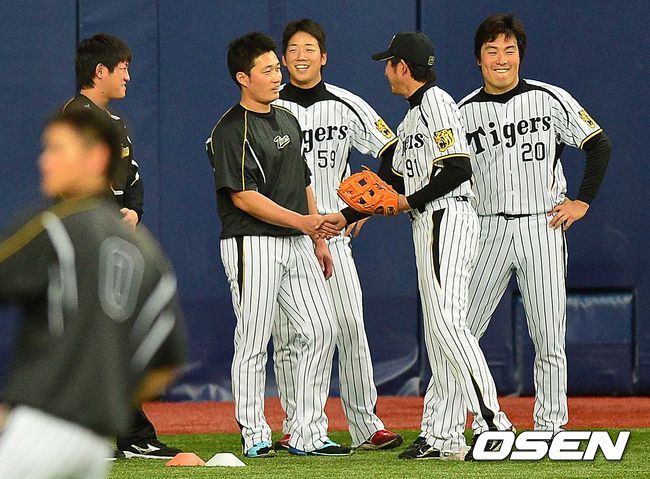 오승환이 3일 오후 일본 오사카 교세라돔에서 열리는 '2014 일본프로야구' 한신 타이거스 대 주니치 드래건스의 경기를 앞두고 한신 이토 코치와 대화를 나누고 있다.