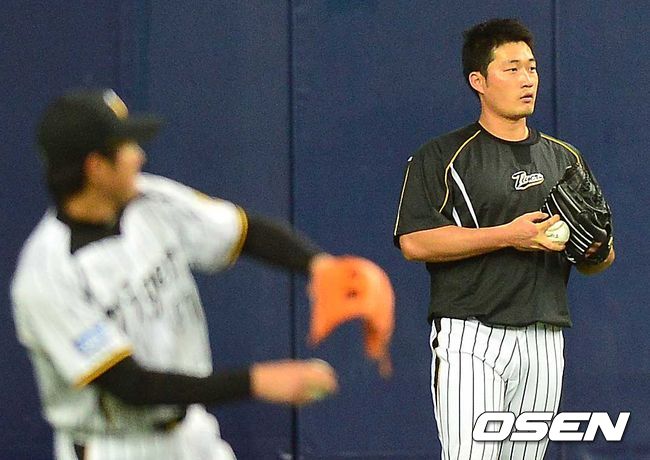 오승환이 3일 오후 일본 오사카 교세라돔에서 열리는 '2014 일본프로야구' 한신 타이거스 대 주니치 드래건스의 경기를 앞두고 외야에서 캐치볼 훈련을 진행하고 있다.