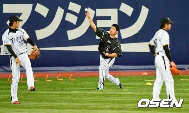오승환이 3일 오후 일본 오사카 교세라돔에서 열리는 '2014 일본프로야구' 한신 타이거스 대 주니치 드래건스의 경기를 앞두고 외야에서 캐치볼 훈련을 진행하고 있다.