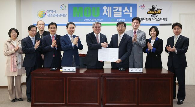 안양시청소년육성재단(대표이사 조용덕)과 안양한라아이스하키단(단장 이석민)이 3일 오전 안양시청 3층 간부회의실에서 지역 청소년의 건전한 육성지원 및 연고구단의 지역연계강화를 통한 공동발전을 모색하고자 업무제휴 협약을 체결했다.