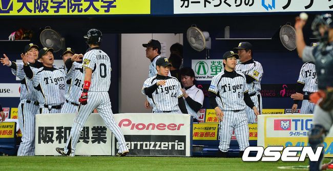 1회말 한신 공격 2사 만루 상황 후쿠도메 타석 때 주니치 선발 야마우치의 폭투로 3루주자 야마토가 홈을 밟은 뒤 더그아웃 동료들과 인사를 나누고 있다.