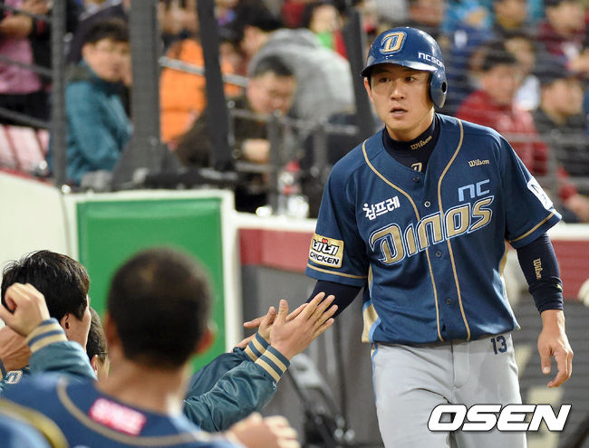 3일 오후 광주-기아챔피언스 필드 에서 열린 '2014 한국야쿠르트 세븐 프로야구' KIA 타이거즈와 NC 다이노스 경기,2회초 2사 1,2루 오정복의 적시타때 2루주자 손시헌 득점을 올리며 덕아웃 동료들의 축하를 받고 있다.