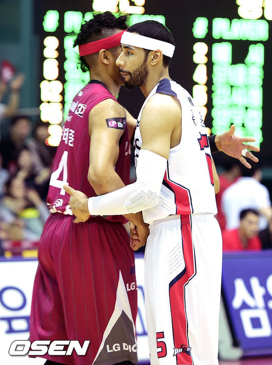 3일 오후 경남 창원실내체육관서 진행된 '2013-2014 프로농구 챔피언 결정전 2차전 창원 LG와 울산 모비스의 경기, 1쿼터 LG 문태종과 모비스 문태영이 인사를 나누고 있다.