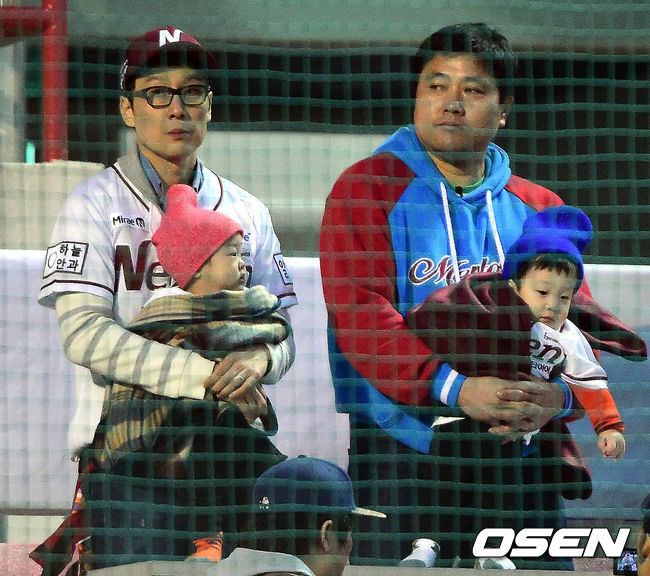 3일 오후 서울 목동구장에서 열린 '2014 한국야쿠르트 세븐 프로야구' 넥센 히어로즈와 두산 베어스의 경기, 이휘재가 자신의 쌍둥이 아들과 양준혁과 함께 경기를 관람하고 있다.