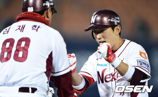 3일 오후 서울 목동구장에서 열린 '2014 한국야쿠르트 세븐 프로야구' 넥센 히어로즈와 두산 베어스의 경기 2회말 2사 만루 서건창이 2타점 적시타를 치고 심재학 코치와 하이파이브를 하고 있다.