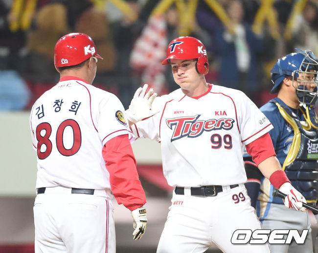 3일 오후 광주-기아챔피언스 필드 에서 열린 '2014 한국야쿠르트 세븐 프로야구' KIA 타이거즈와 NC 다이노스 경기,2회 선두타자 필 좌중월 솔로홈런을 날리고 홈인 김창희 코치의 환영을 받고 있다.