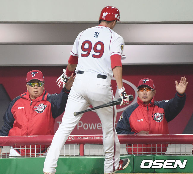 3일 오후 광주-기아챔피언스 필드 에서 열린 '2014 한국야쿠르트 세븐 프로야구' KIA 타이거즈와 NC 다이노스 경기,2회말 선두타자 필 솔로홈런을 날리고 홈인 선동렬 감독의 환영을 받고 있다.
